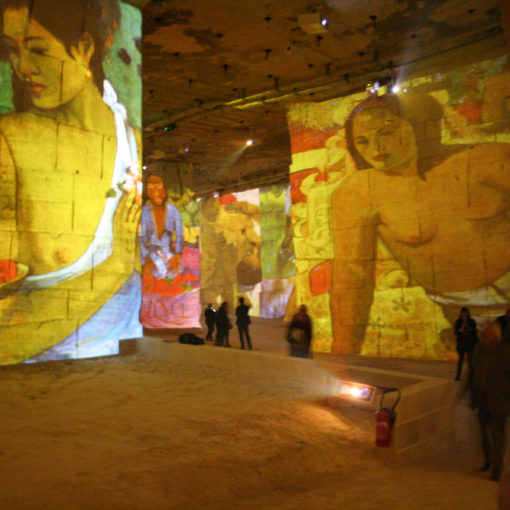 L’installation est composée de 7 projecteurs 1400×1050 pour la partie sol et 2 projecteurs HD 1920×1080 pour couvrir les deux ensembles de cubes visibles depuis le balcon.