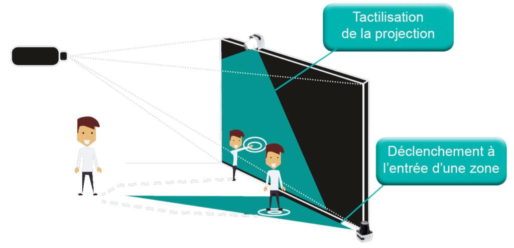 Grâce à l’installation de capteurs laser autour de la zone de projection, les murs, le sol, et les surfaces deviennent tactiles !